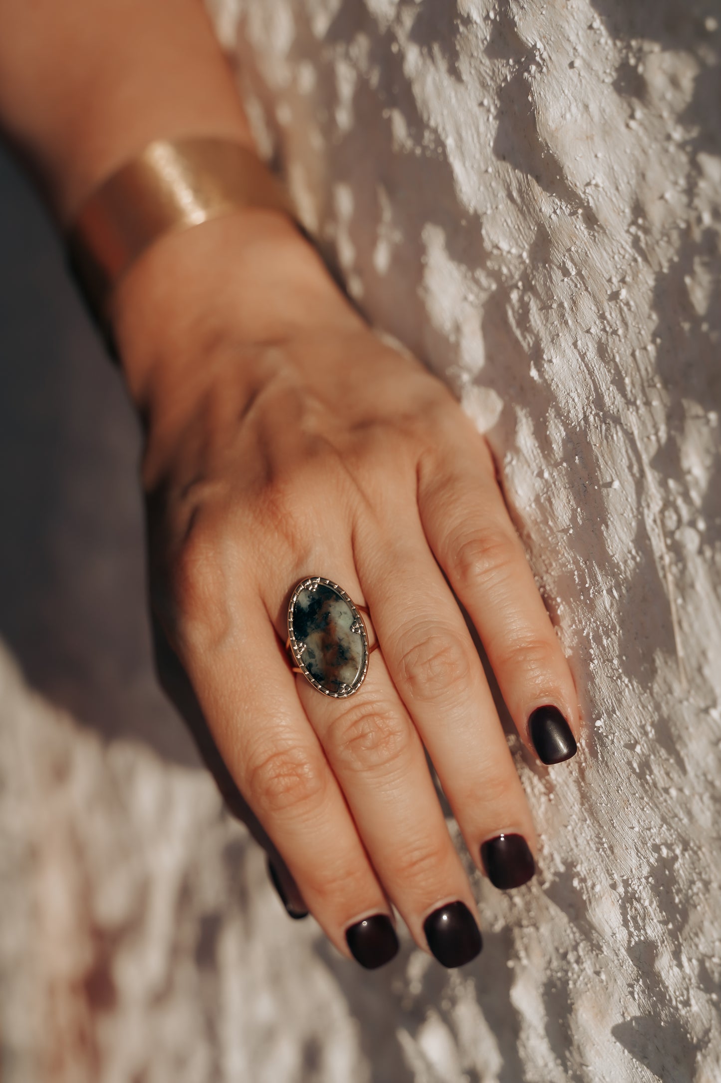Bague large dorée en acier inoxydable, sertie d’une turquoise africaine ovale. L’anneau doré qui entoure la pierre présente un aspect structuré et travaillé, mêlant finesse et relief pour un rendu à la fois organique et sophistiqué. Sa silhouette imposante affirme le poignet tout en laissant la turquoise occuper le premier plan.