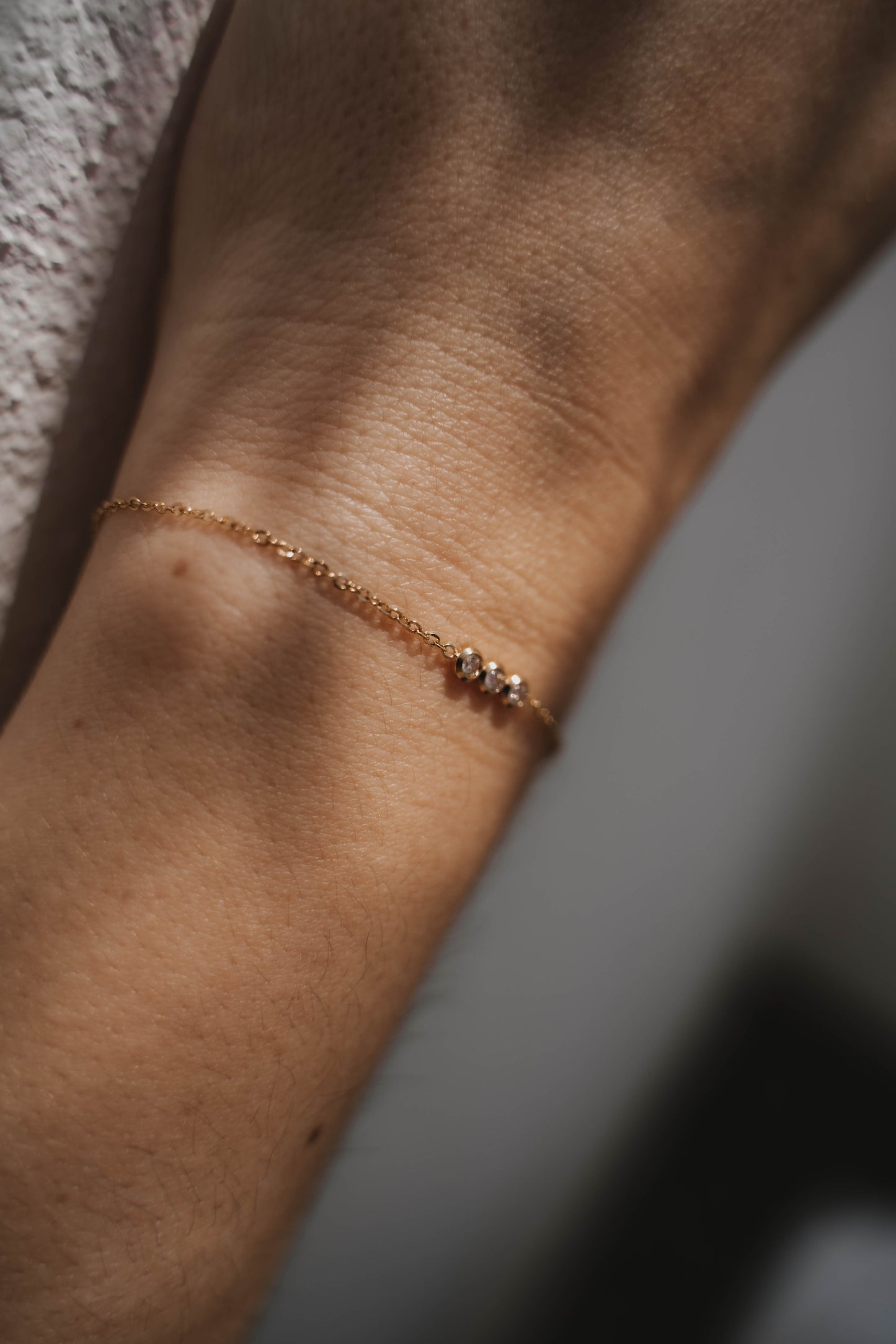 Bracelet en acier inoxydable doré, composé d’une fine chaîne et de trois zircons étincelants au centre. Un bijou délicat et lumineux, idéal pour apporter une touche d’élégance subtile à vos tenues.