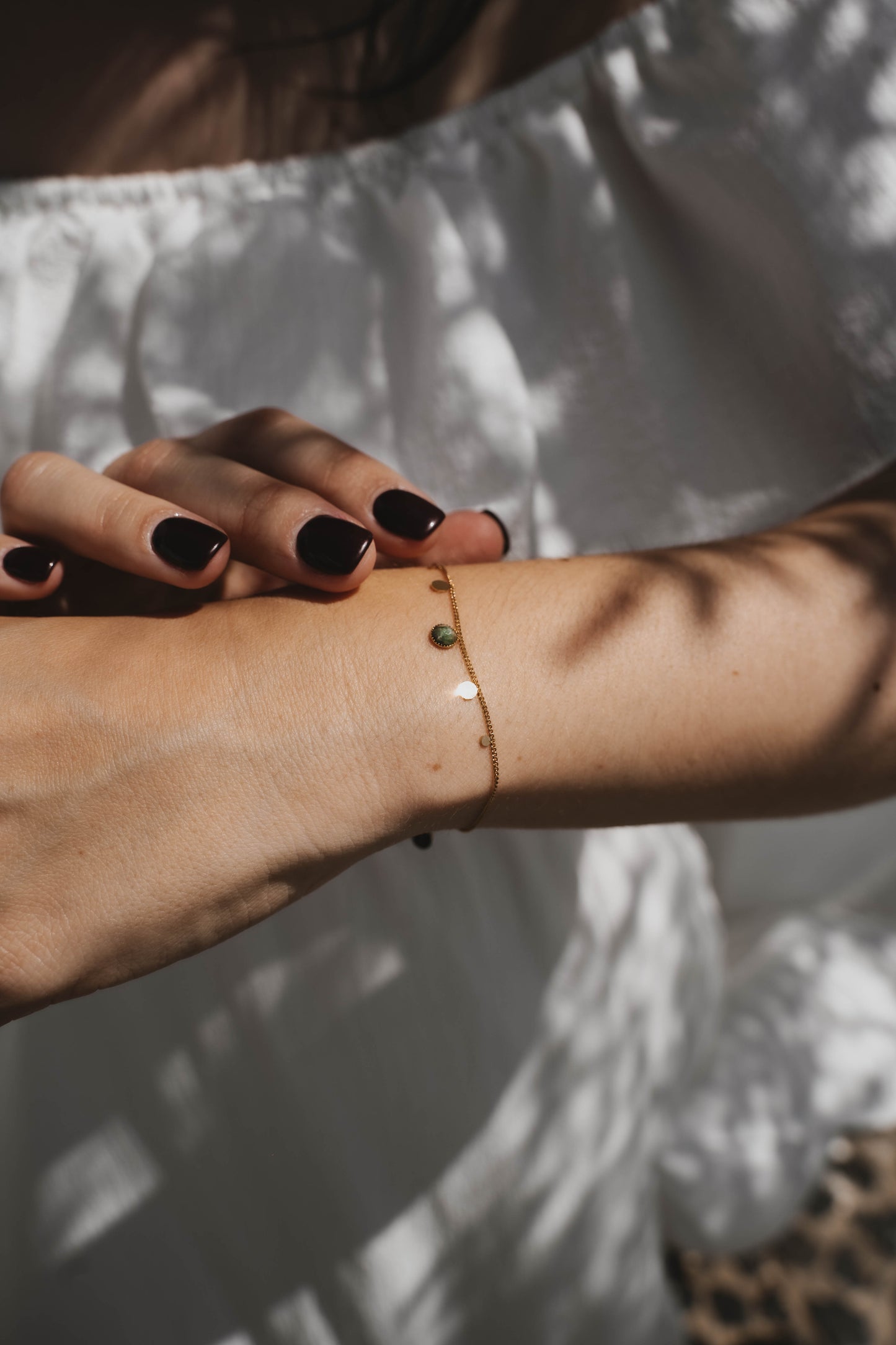 Bracelet en acier inoxydable doré avec une chaîne très fine, orné de petites pampilles dorées et d’une pampille centrale en jaspe verte facettée. Un bijou délicat qui allie élégance et une touche de couleur naturelle.