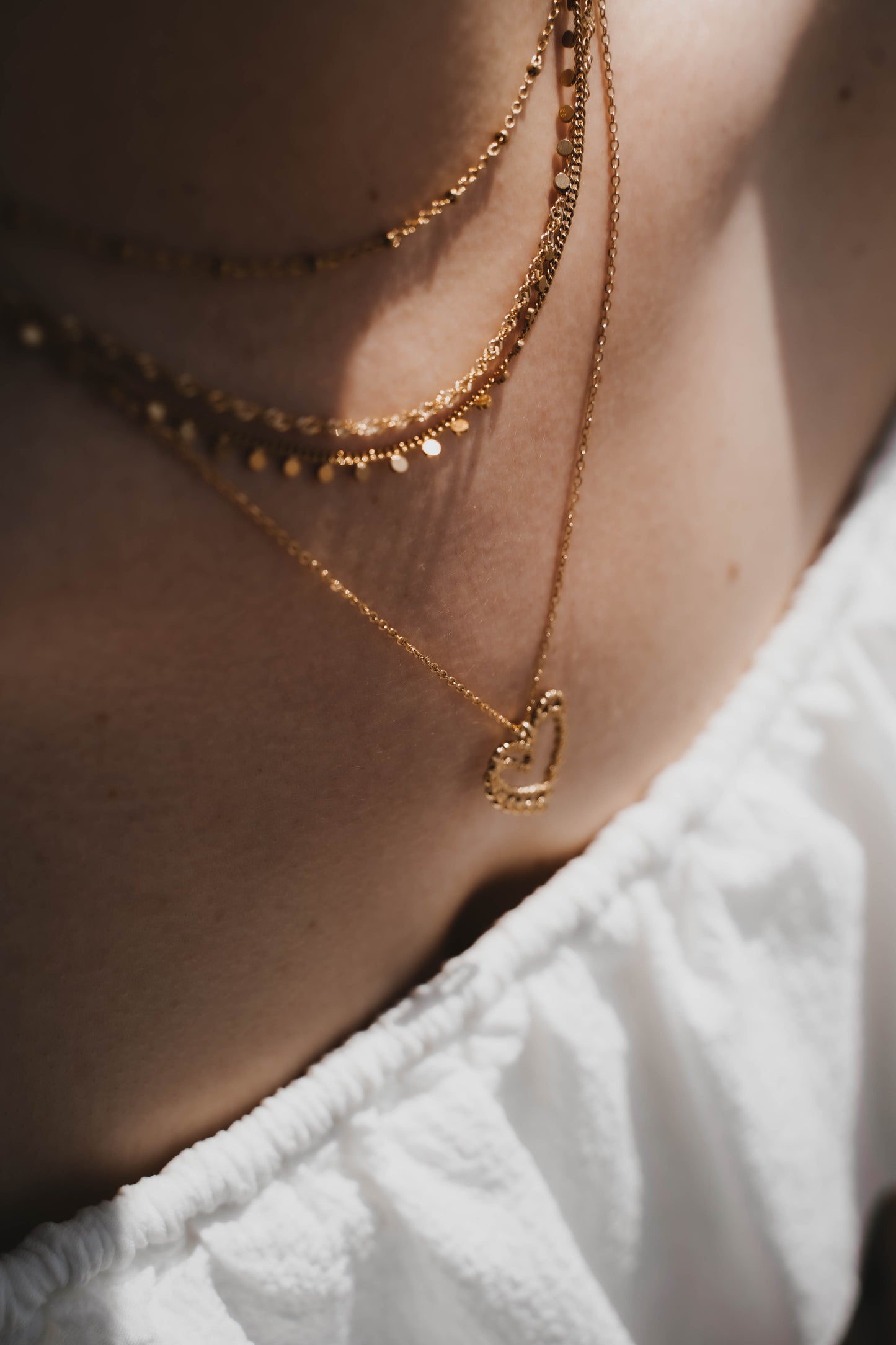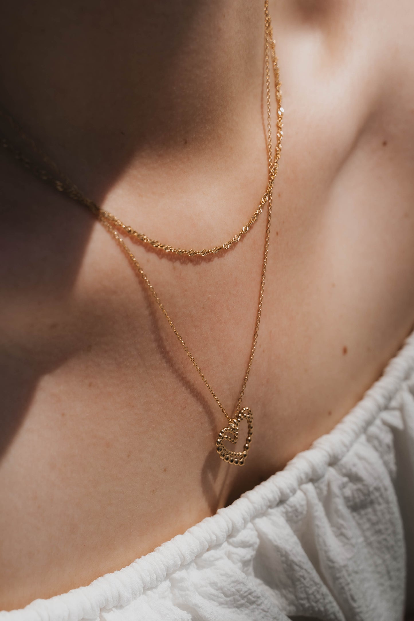 Collier double en acier inoxydable doré, composé d’une première chaîne torsadée et d’une seconde chaîne fine plus longue ornée d’un pendentif cœur dédoublé. Ce bijou élégant et romantique mêle textures et détails raffinés pour sublimer le décolleté.