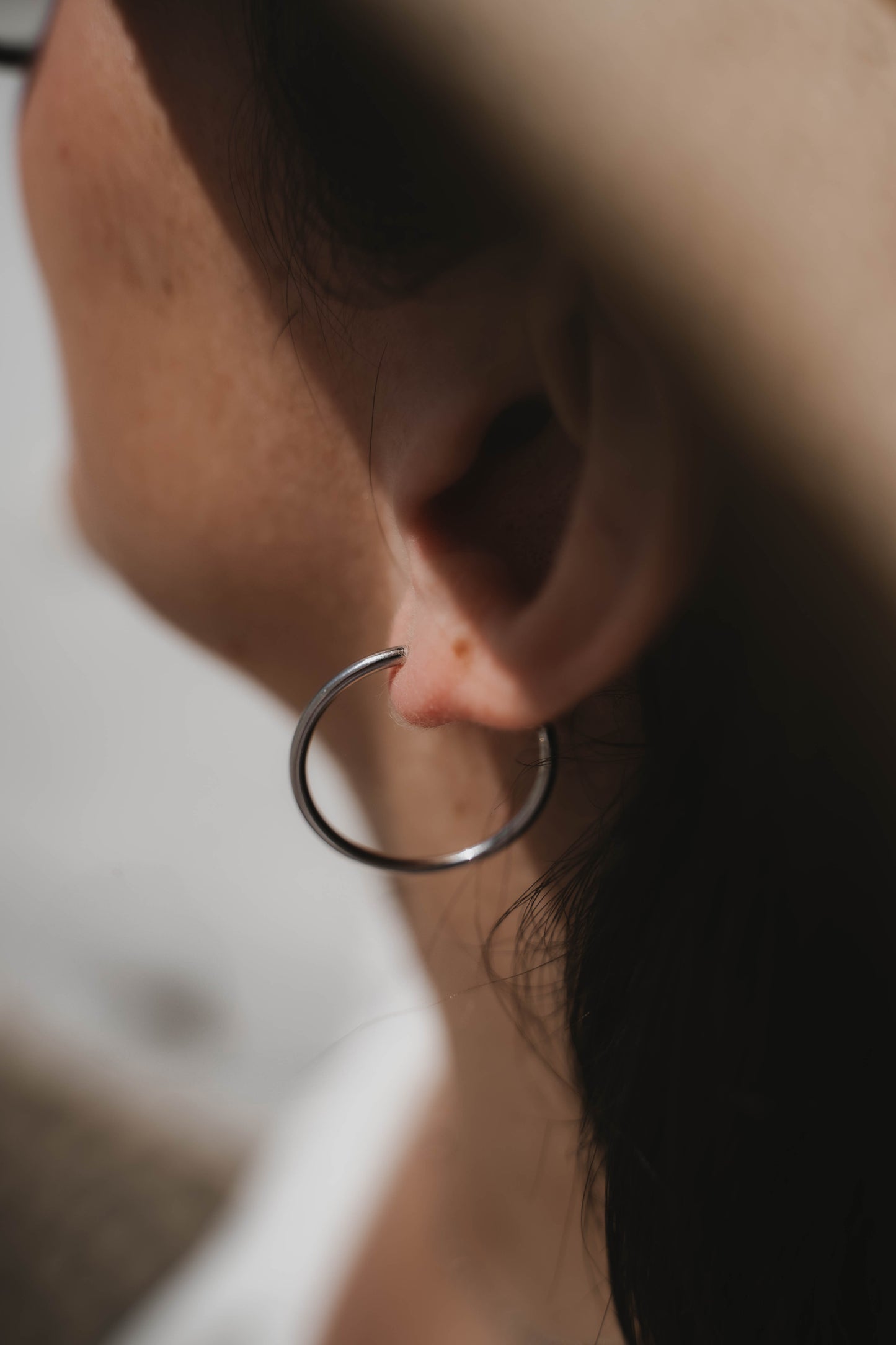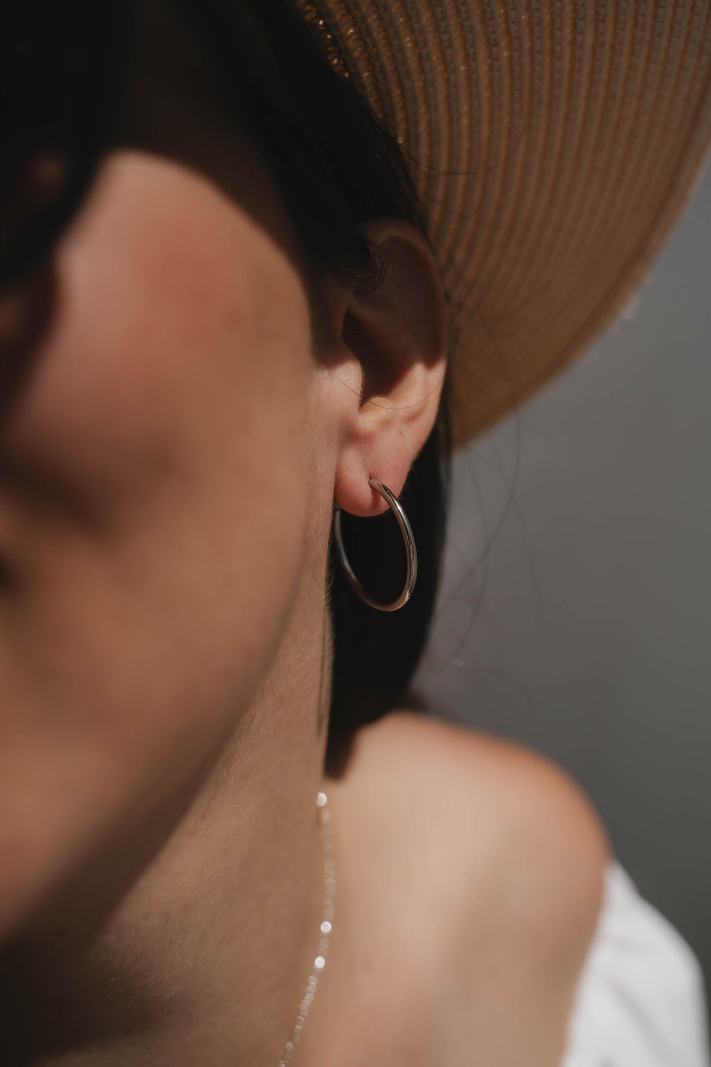 Créoles fines en acier inoxydable argenté, diamètre 3 cm. Un bijou intemporel, facile à porter au quotidien.