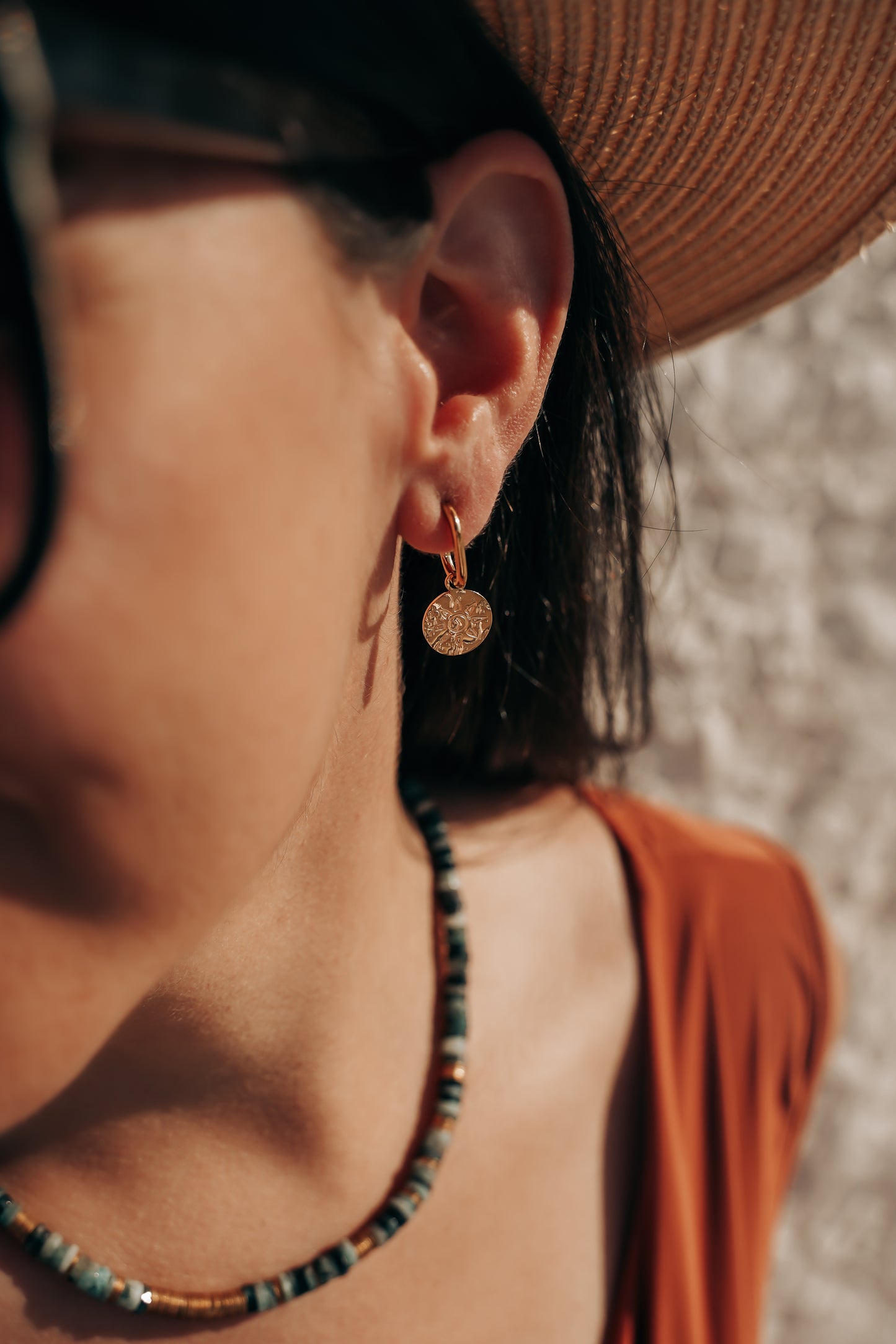 Mini créoles en acier inoxydable finition doré, chacune ornée d’un petit médaillon martelé gravé d’un motif soleil délicat. Le médaillon martelé capte la lumière tandis que le dessin du soleil apporte une note graphique et poétique. L’ensemble forme une paire de créoles discrètes mais travaillées, idéales pour un look quotidien avec une touche d’âme artisanale.