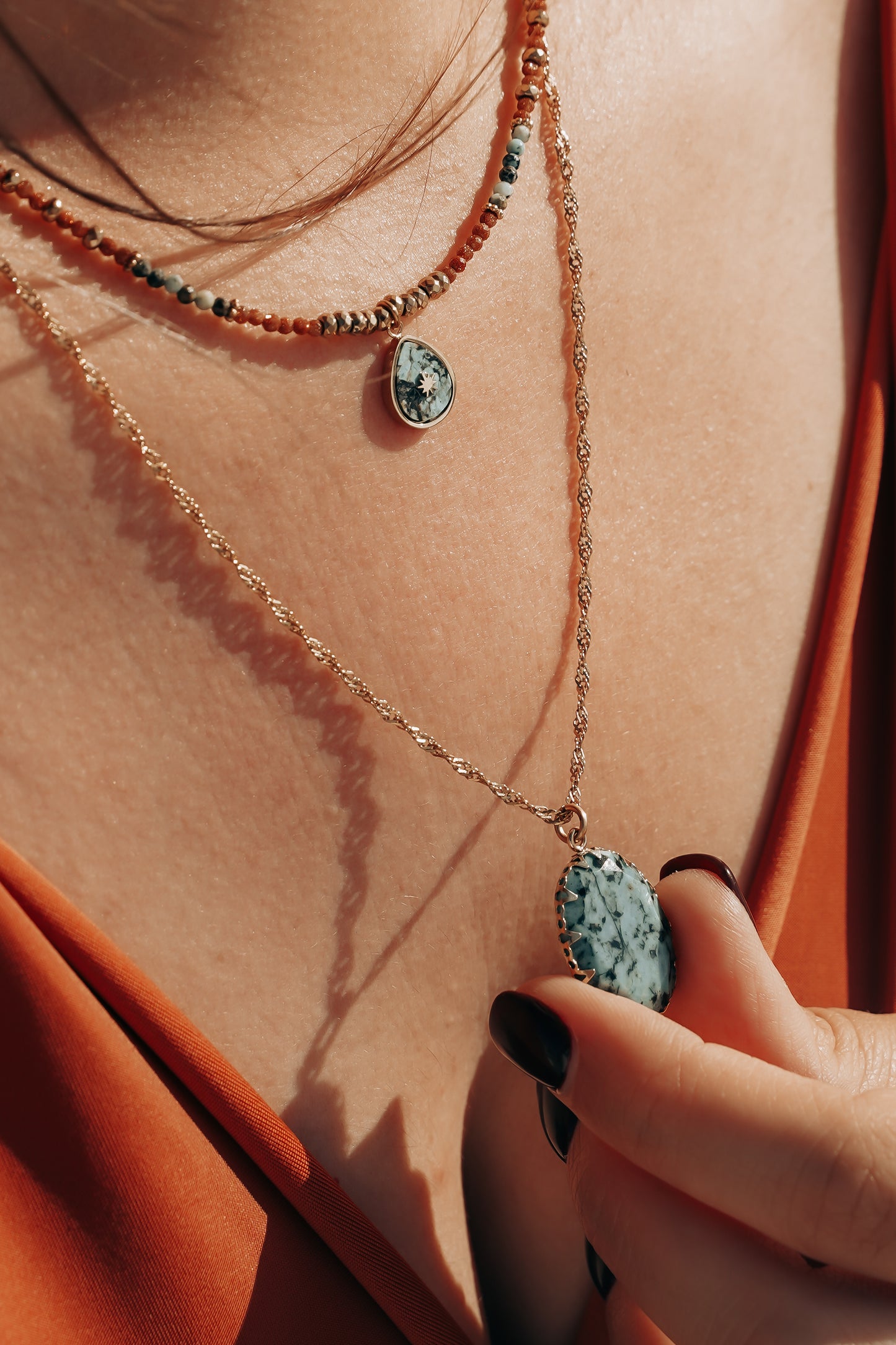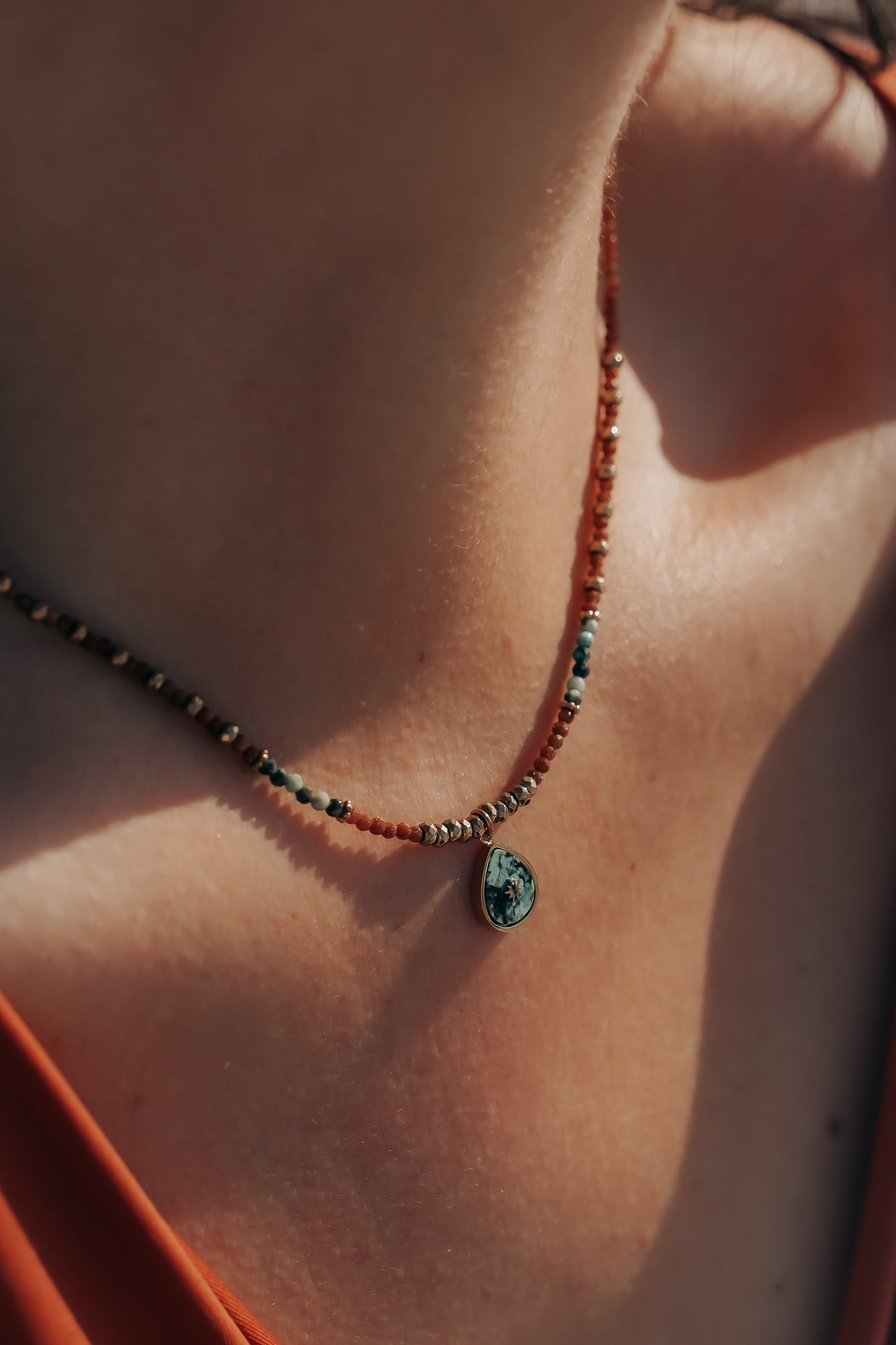 Collier composé de fines perles naturelles : pierre de sable aux reflets chauds, petites facettes de turquoise africaine et perles d’hématite sombre, assemblées pour créer un contraste minéral et lumineux. Au centre, un médaillon ovale doré à motif étoilé apporte une signature graphique et poétique. Montage sobre et léger — longueur réglable via un fermoir mousqueton pour adapter le collier à différents décolletés.