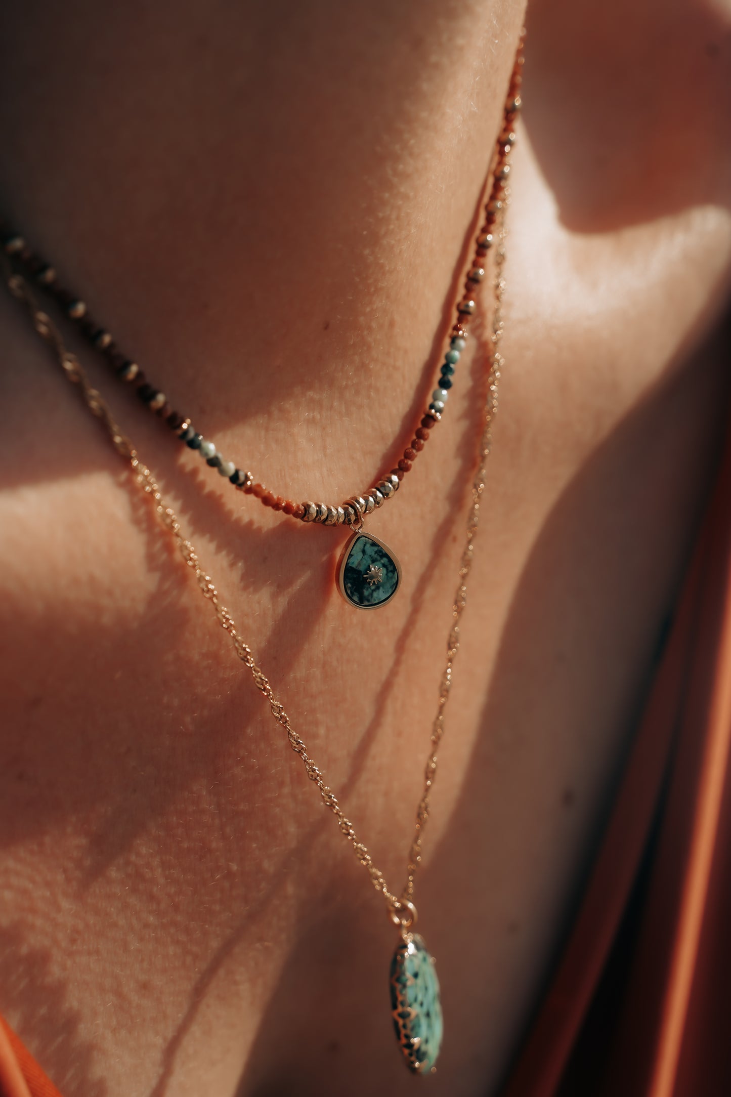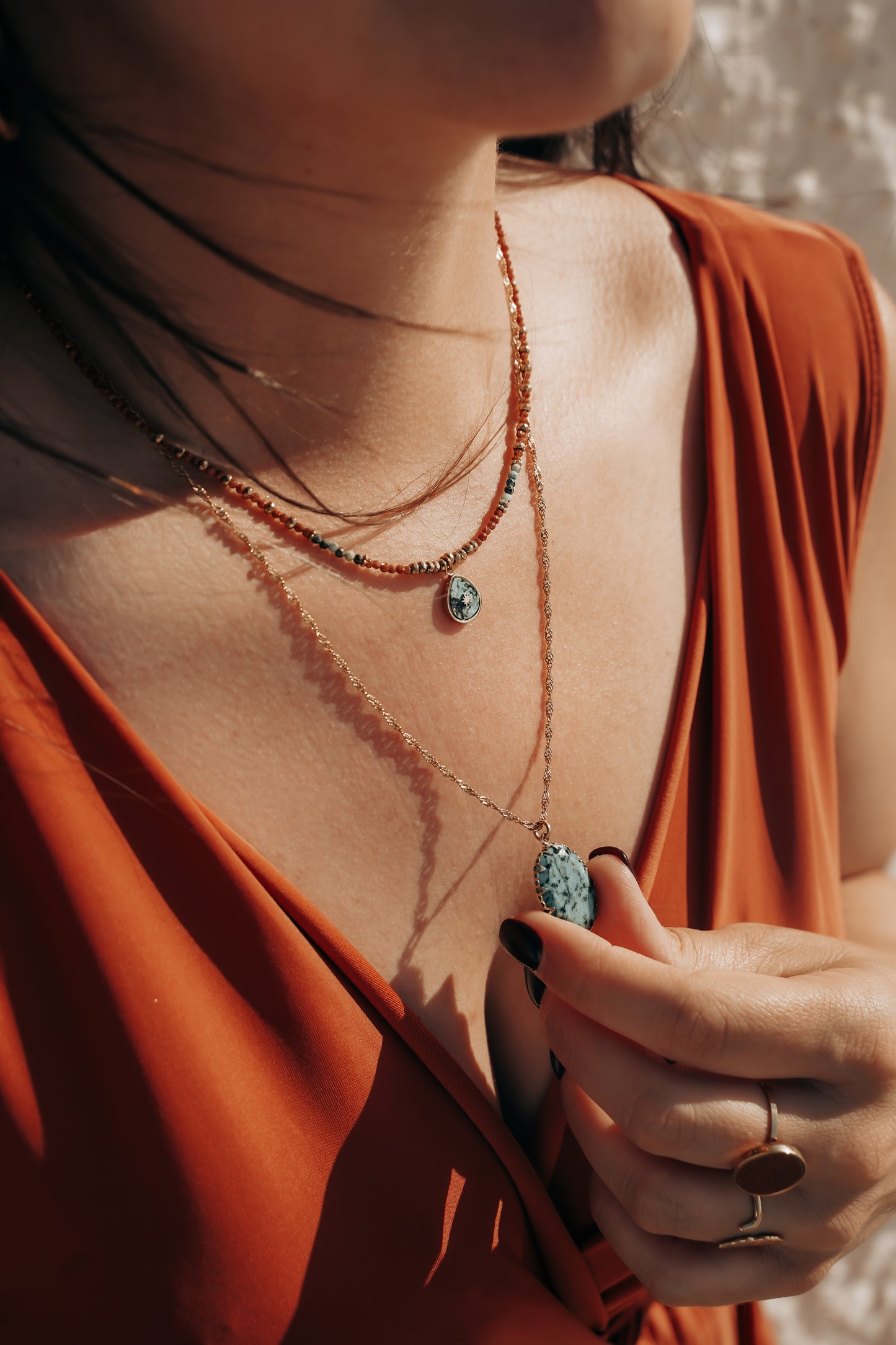 Porte-le sur une blouse blanche ou un pull en maille légère pour laisser ressortir les nuances de la turquoise et le scintillement de la pierre de sable. Superpose avec des colliers fins dorés pour un effet layering harmonieux ; fonctionne aussi très bien avec des pièces en cuir pour un contraste texturé.