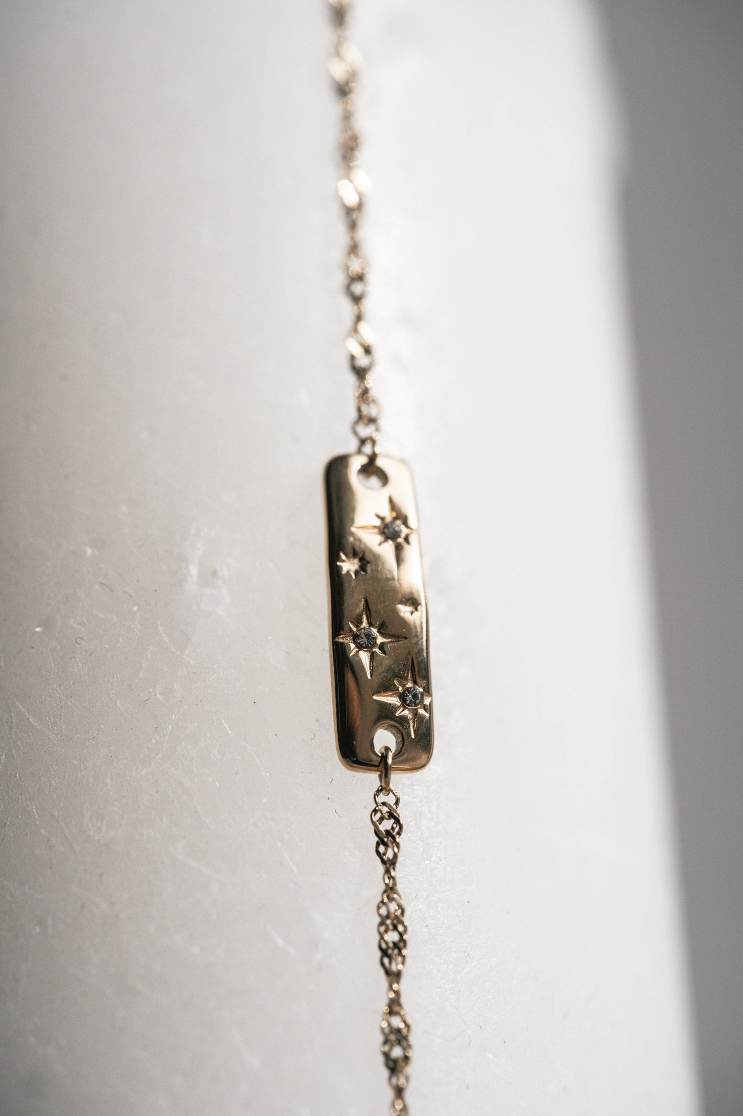 Bracelet en acier inoxydable doré composé d’une chaîne fine délicatement torsadée, offrant un éclat subtil et raffiné. Au centre, une barrette élégante accueille plusieurs petites étoiles étincelantes, chacune sertie d’un strass lumineux. L’ensemble crée un bijou poétique, délicat et féminin, parfait pour apporter une touche de lumière au poignet.