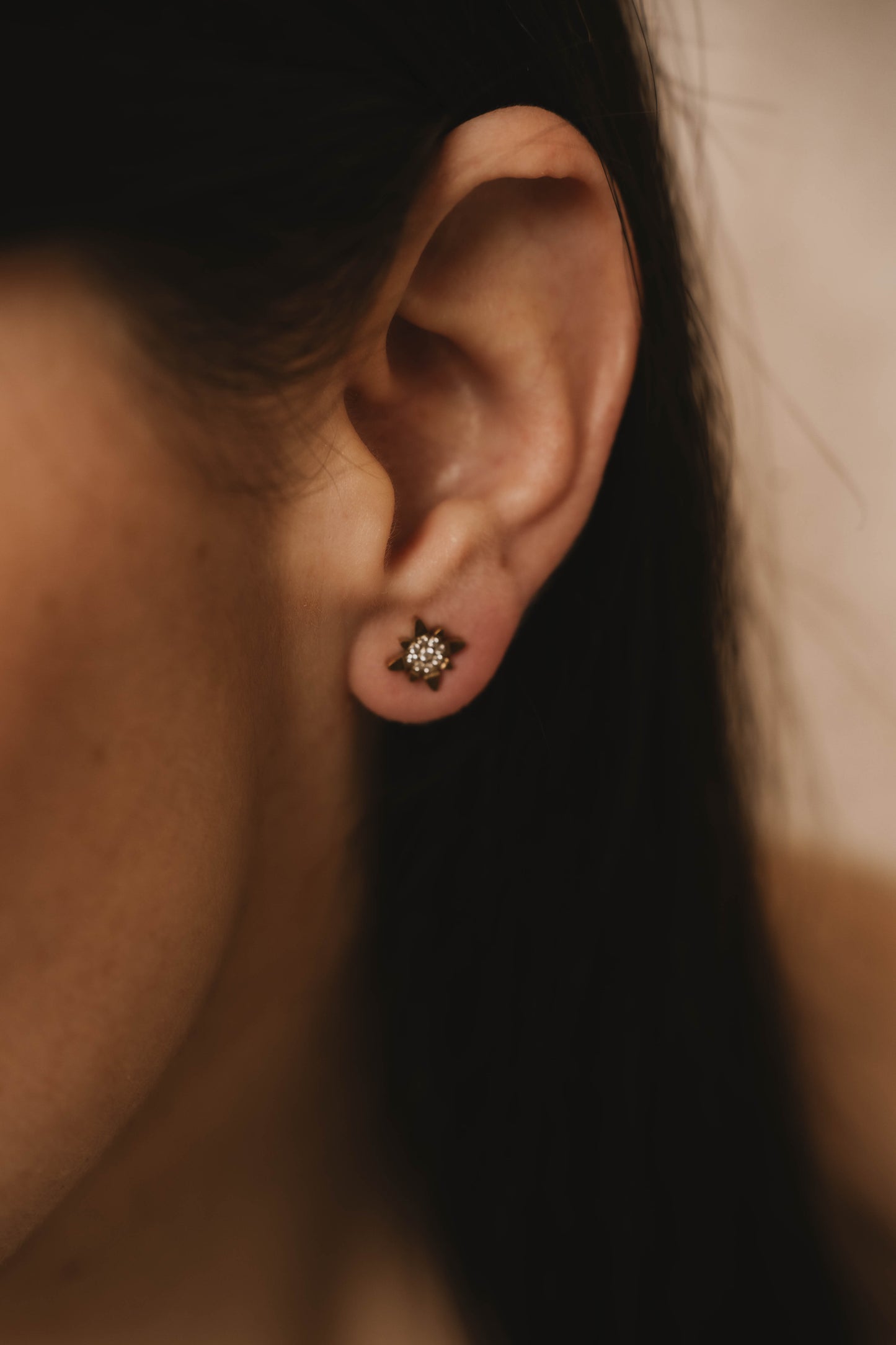 Puces d’oreilles en acier inoxydable doré, dessinées en forme d’étoile et serties d’oxydes de zirconium scintillants. Leur éclat subtil capte la lumière avec finesse, offrant un bijou délicat à l’élégance céleste. Un indispensable, à porter seul ou en accumulation.