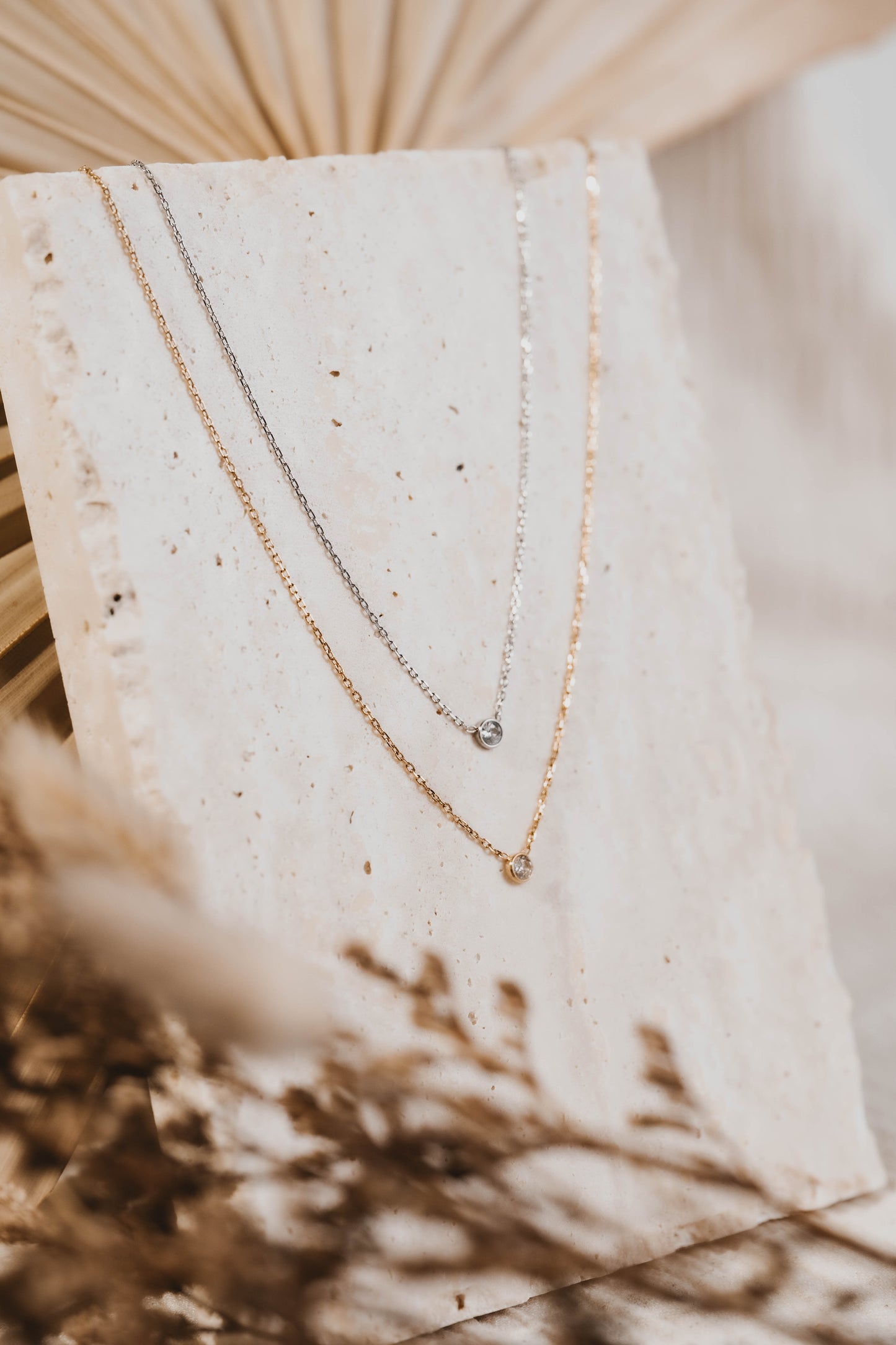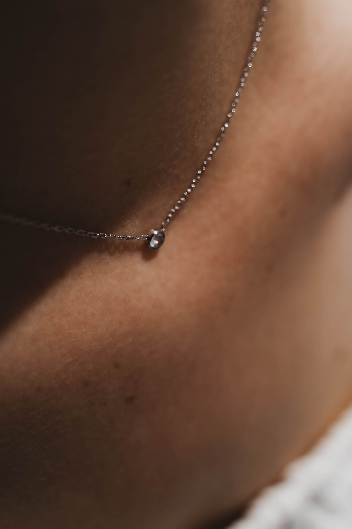 Collier en acier inoxydable argenté, composé d’une chaîne fine et d’un zircon blanc étincelant en son centre. Un bijou intemporel et délicat qui illumine le décolleté avec élégance.