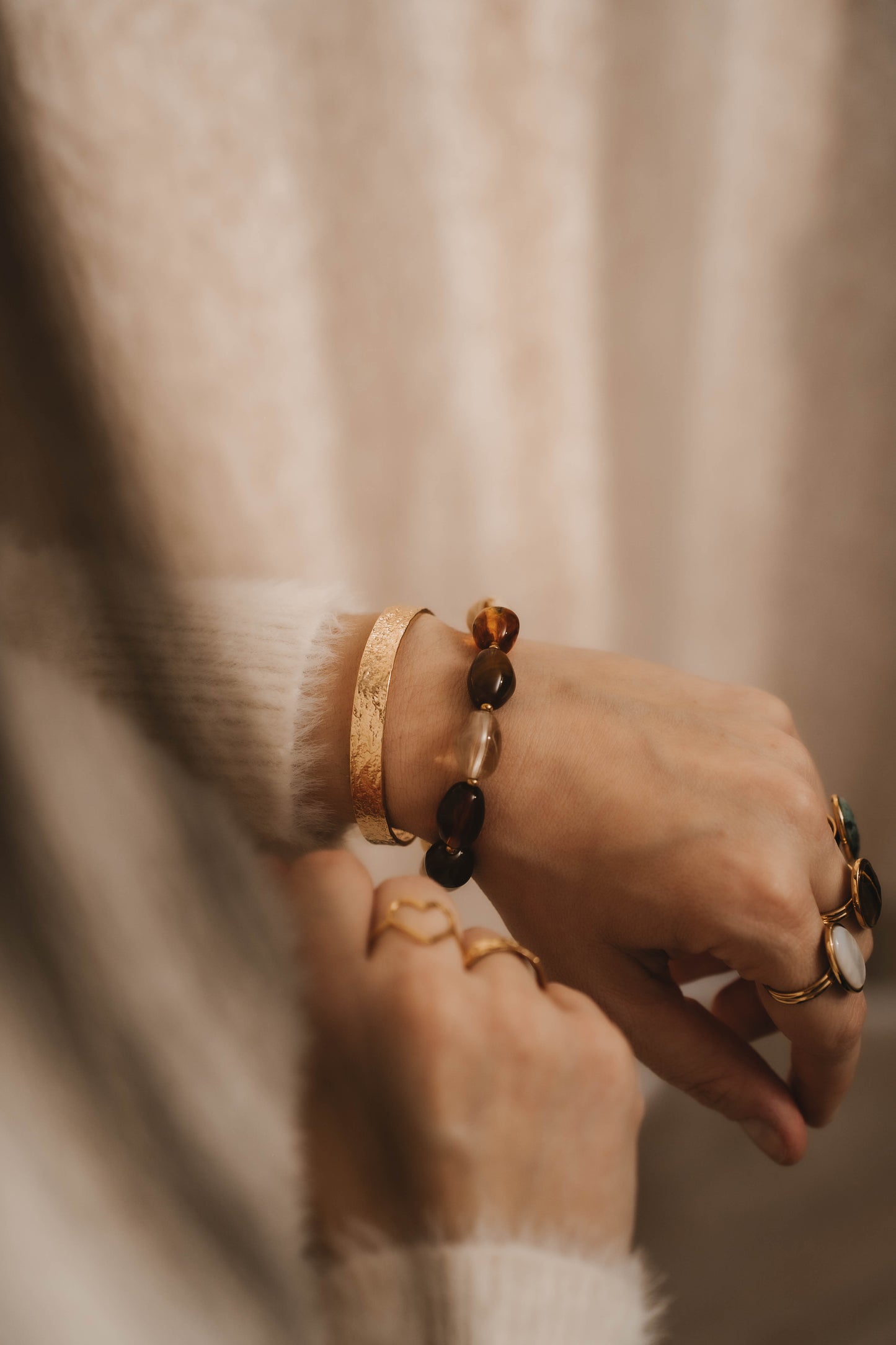 Jonc rigide en acier inoxydable doré, à la finition martelée, conçu pour s’ajuster facilement au poignet. Sa texture irrégulière capte la lumière et apporte du relief, tandis que sa forme épurée en fait un bijou élégant et affirmé. Un essentiel du quotidien, facile à porter seul ou en accumulation.