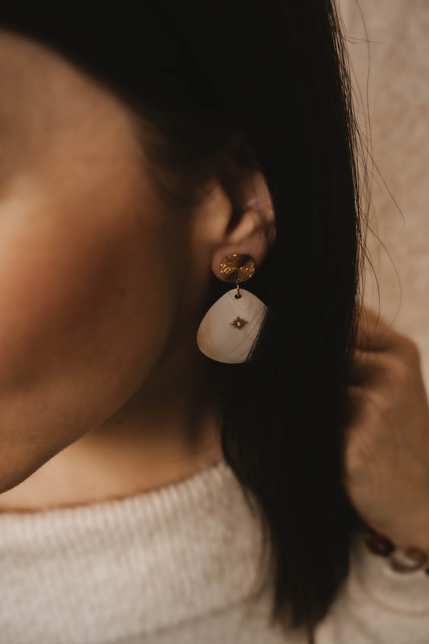 Boucles d’oreilles pendantes en acier inoxydable doré, ornées d’une goutte en nacre naturelle délicatement décorée d’une étoile. Les reflets irisés de la nacre apportent douceur et lumière, tandis que le motif étoilé ajoute une touche céleste et symbolique. Un bijou délicat, à l’élégance subtile et intemporelle.