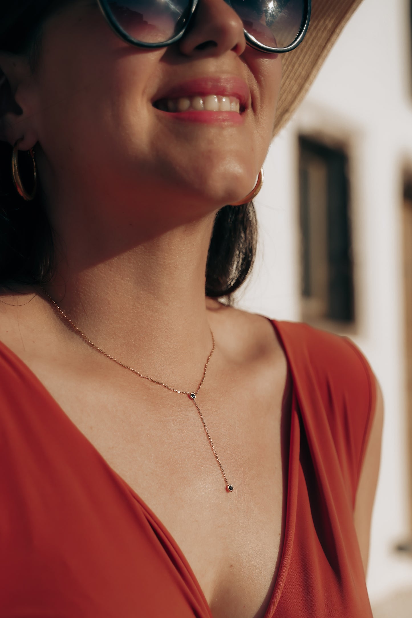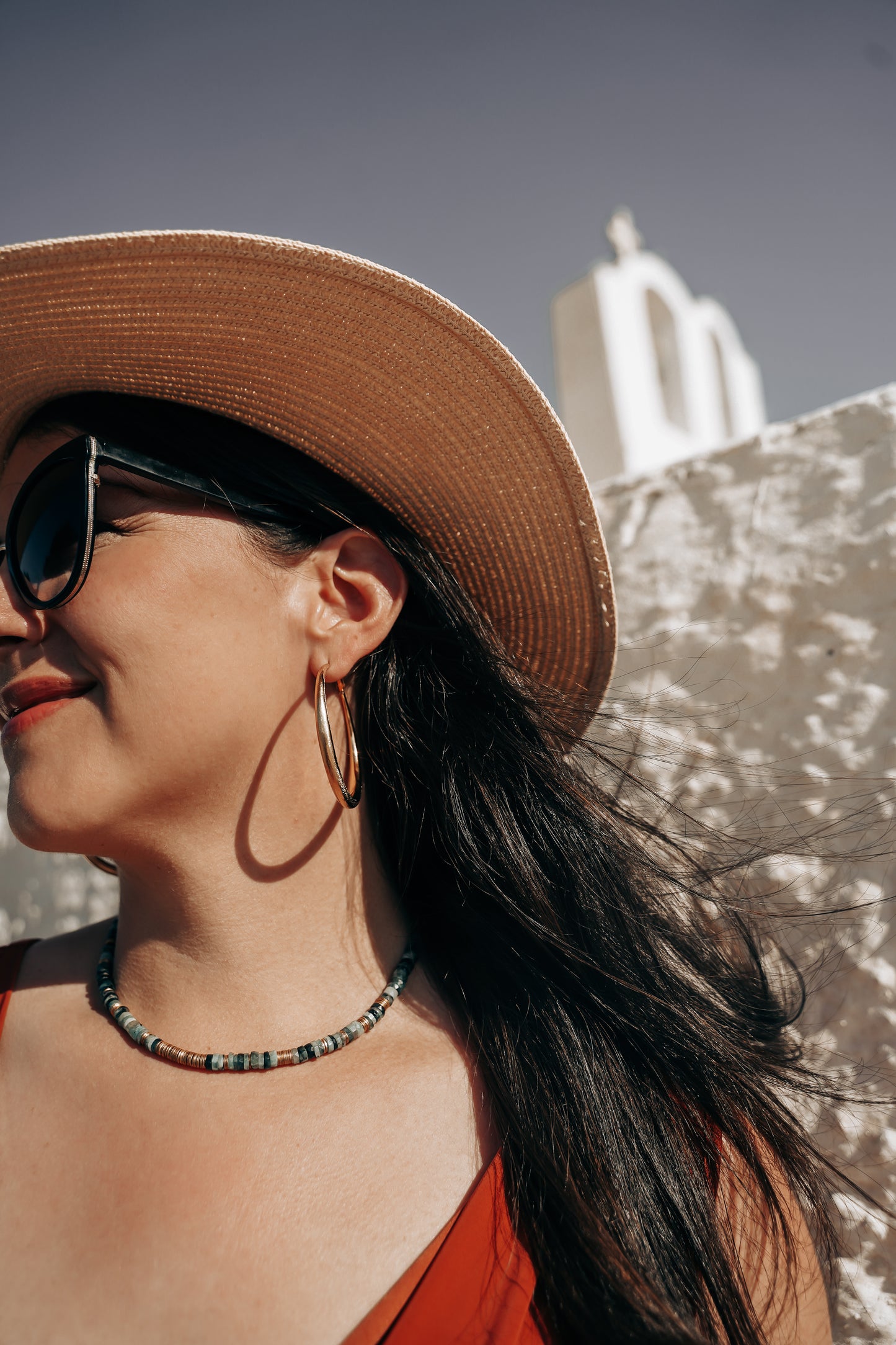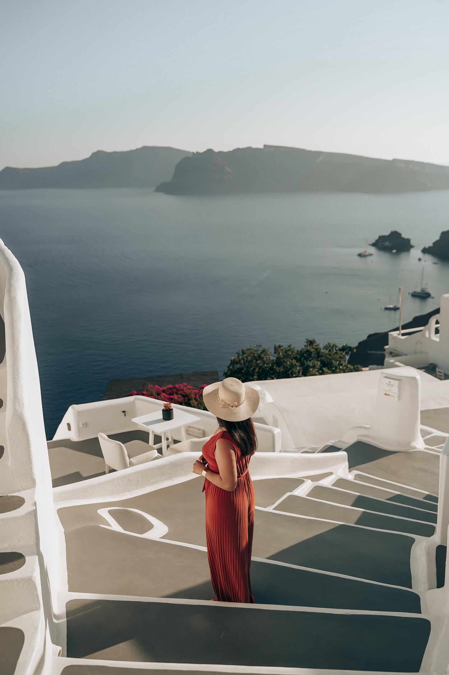 Née sous la lumière dorée d’Oïa, cette collection célèbre la beauté des fins de journée, quand le soleil caresse les murs blancs et teinte l’horizon de reflets ambrés.